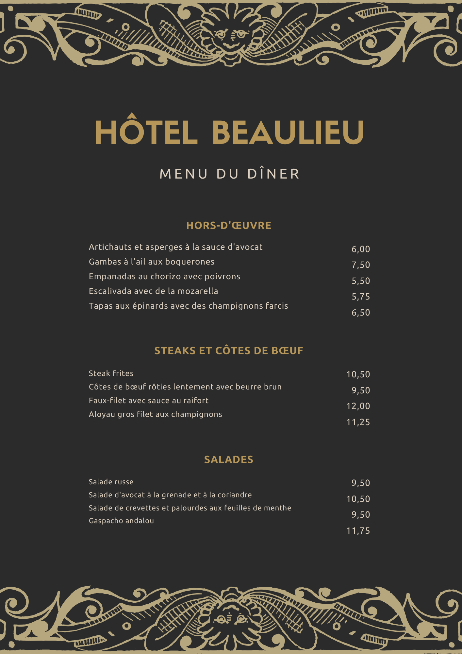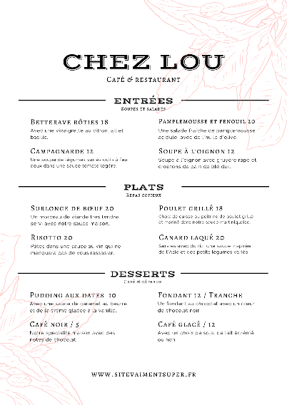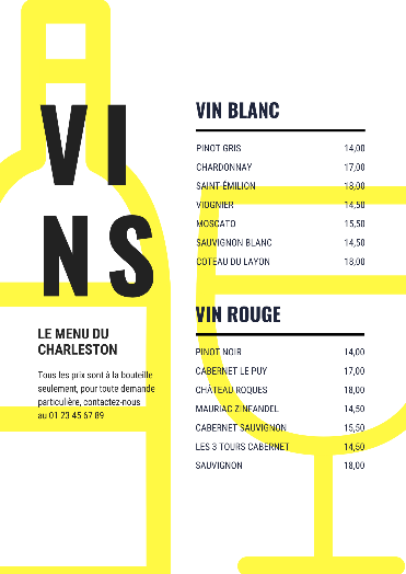 Le créateur gratuit de menus en ligne de Copees vous propose une grande variété de modèles. Que vous recherchiez un menu de restaurant, un menu italien ou une carte des vins, chacun de nos modèles de menus est conçu par des professionnels et prêt à être utilisé tel quel. En 3 clics et en 30 mn, vous recevrez vos menus dans votre restaurant ! Et si vous trouvez moins chers pour la même qualité, et pour les mêmes délais de livraison, envoyez-nous votre devis à ccadeau@copees.com, on vous offre votre commande !